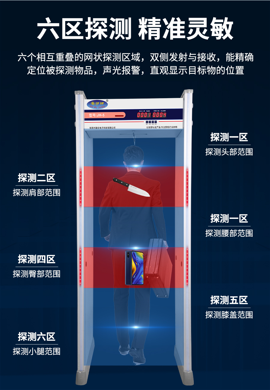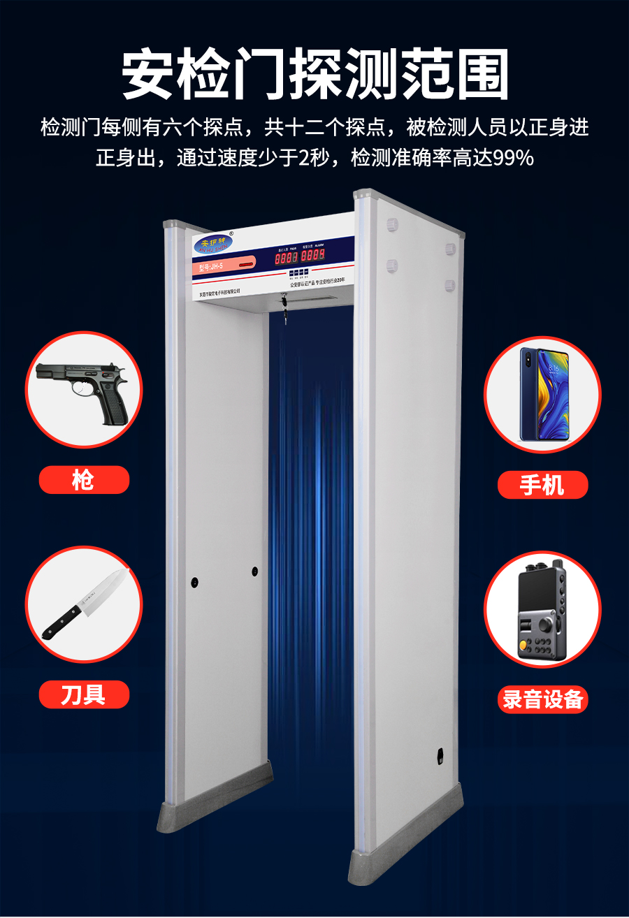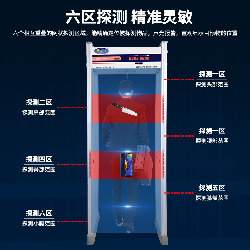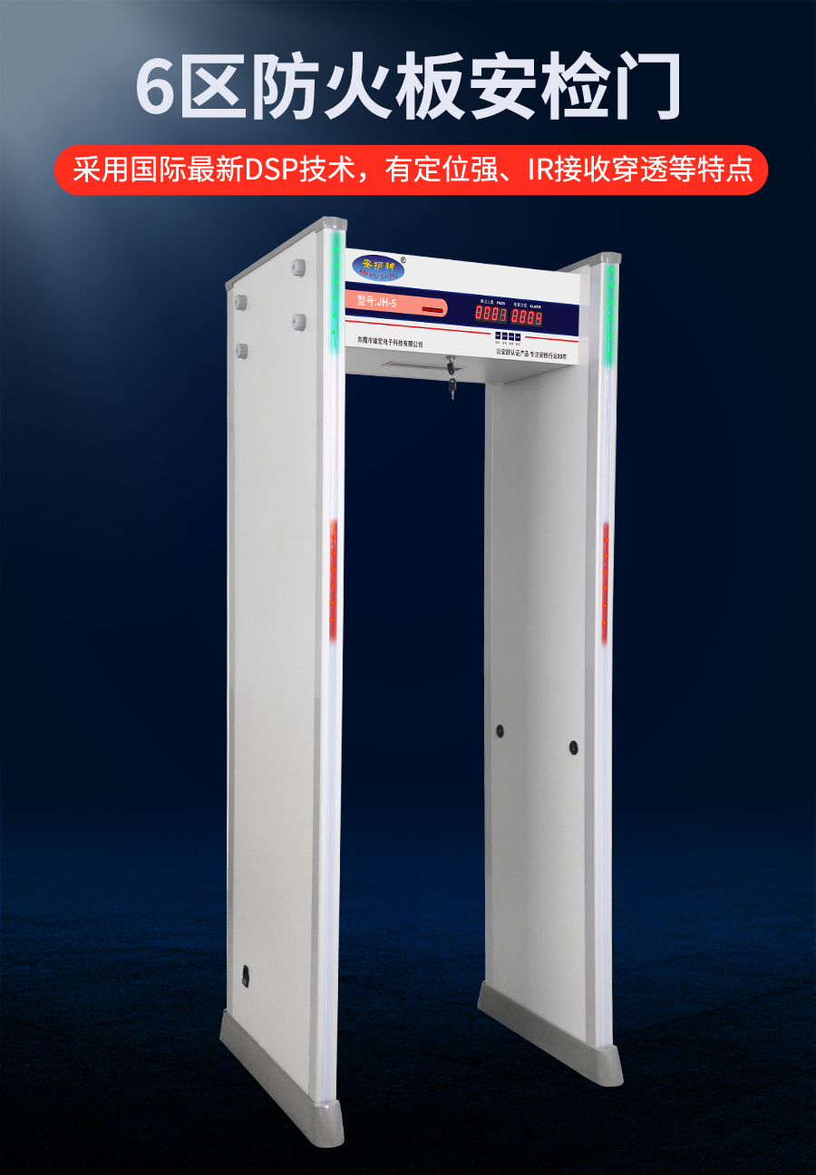 JH-5 六区安检门采用数字脉冲技术与多区位探测系统采用先进技术,可检测小至回形针的铜铝,灵敏度多级调节,通过认证,适用于机场、车站等公共场所违禁品筛查。大型活动辅助筛查刀具、枪支等金属违禁品,兼容铜铝检测需求,厂家直销,提供终身维护与灵敏度调试服务!