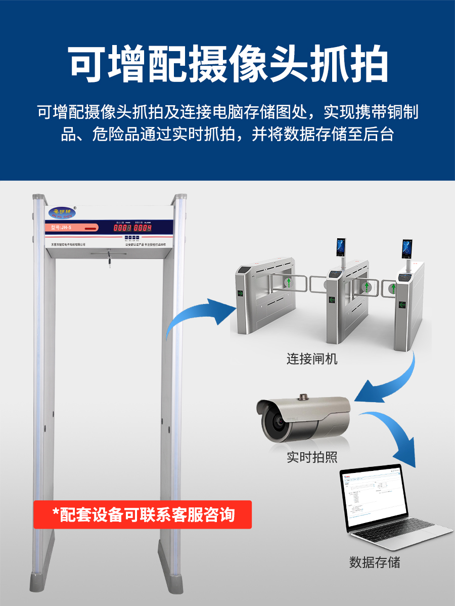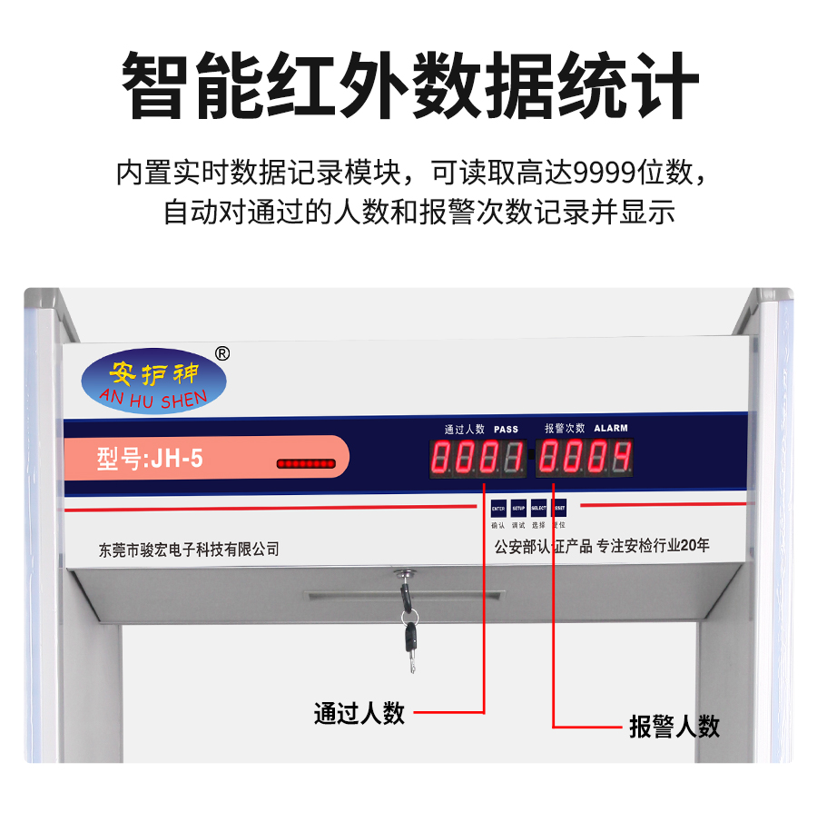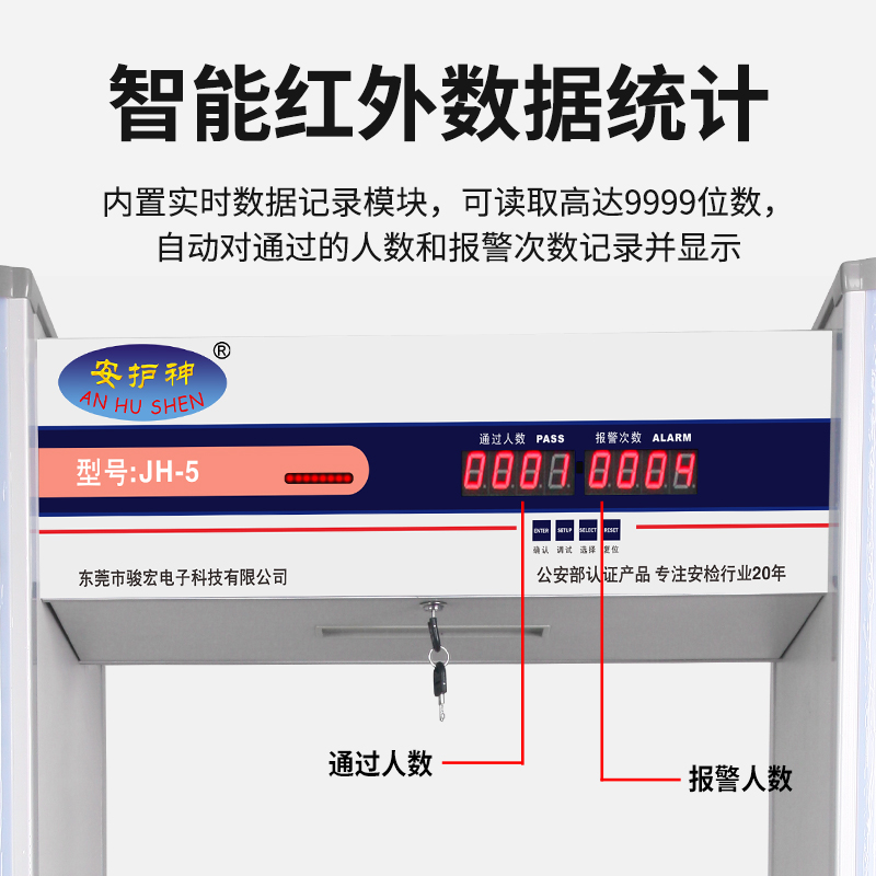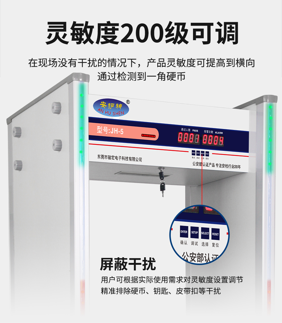 JH-5 六区安检门采用数字脉冲技术与多区位探测系统采用先进技术,可检测小至回形针的铜铝,灵敏度多级调节,通过认证,适用于机场、车站等公共场所违禁品筛查。大型活动辅助筛查刀具、枪支等金属违禁品,兼容铜铝检测需求,厂家直销,提供终身维护与灵敏度调试服务!
