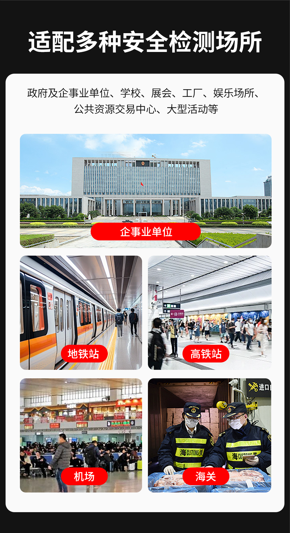 高铁站、火车站、地铁站、机场、客运汽车站,排查汽油、酒精、香蕉水等易燃易爆瓶装液体。 政府单位、会议室、政务大厅、会展中心,常态化液体安全安检防控。 中小学、高考中考考场、各类职业资格考场,杜绝危险液体带入考场。大型商场、酒店宾馆、体育馆、演唱会场馆、医院、写字楼人员出入口安检。